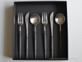 | ハンドルはレジンと呼ばれる合成樹脂の艶消しブラック。見た目は細身な持ち手ですが、力を入れて切りやすいように人差し指が当たる部分が平たく処理されており、人間工学に基づきデザインされています。 ブラックとシルバーの組み合わせは、テーブルコーディネートをバランス良く整え、エレガントさを1ランクも2ランクもアップさせてくれます。 ※黒のギフトBOXにナイフ、フォーク、スプーンが2本ずつ入ったセットです。 ※専用箱付き、無料ラッピング対応商品。 |