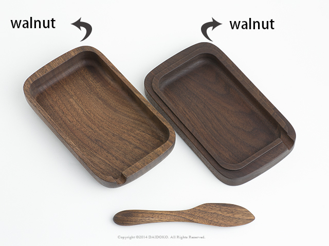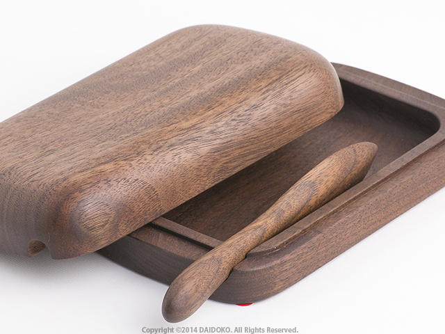 木材の特性により冷蔵庫に入れてもバターが冷えて硬くなるようなことも無く、冷蔵庫から出したばかりのバターもパンに滑らかに塗れるのも木材の特徴。 ナイフの持ち手の太さで調整され、ケース内のバターの横にナイフが丁度収まるようスペースが設けてあります。バターナイフがケースの中に入り込まないようケースにはナイフの太さに合わせたホゾが彫ってあるので、ナイフのハンドル部分がバターでベタベタ、ということがありません。
